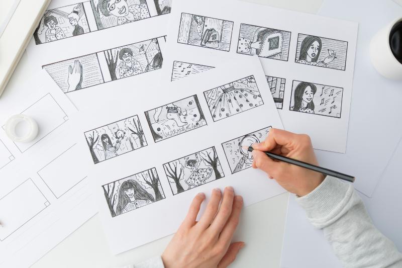 Based on the script, the team creates the Storyboard (E-conte) — a sequence of drawings that define the structure, pacing, and direction of each scene.